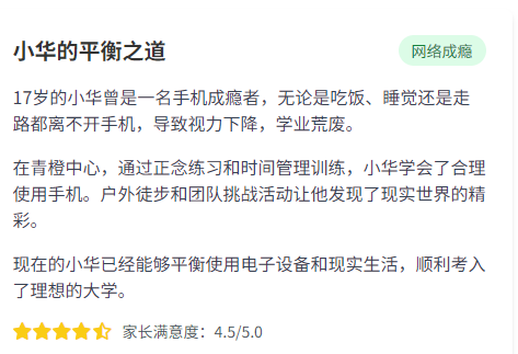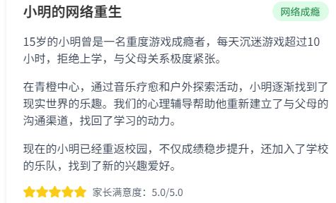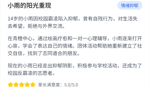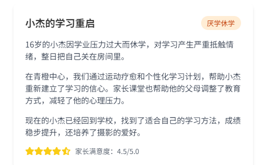 青橙艺术疗愈中心学员家长家长好评一览:在青橙,没有教官与学生的对立,没有冰冷的条规与惩罚。所有教职员工皆化身“志愿者”与“同行者”,以平等、尊重的心态,陪伴青少年走过这段特别的成长旅程。我们营造的是一个自由、安全、被充分信任的环境,鼓励孩子们在这里学习自主管理、自我决策,重新获得对生活的掌控感与责任感。这里不是另一个需要反抗的“学校”,而是一个可以自由呼吸、探索自我的“心灵港湾”。