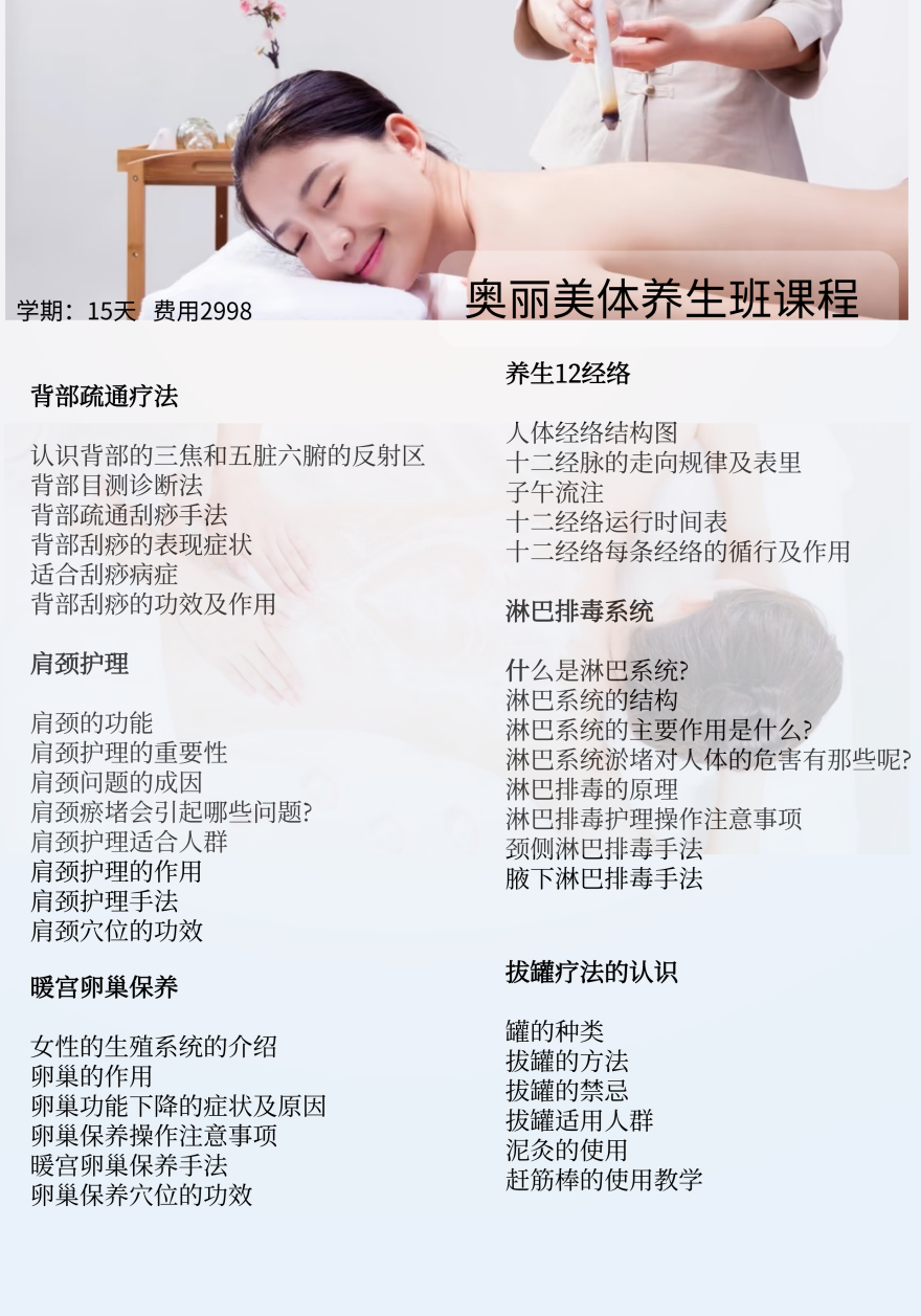在校期间提供客户练习,直接了解自己手法在客户身上的感受,有利于后期就业进入到美容院快速晋升,薪资翻倍。美容美体课程送产品工具